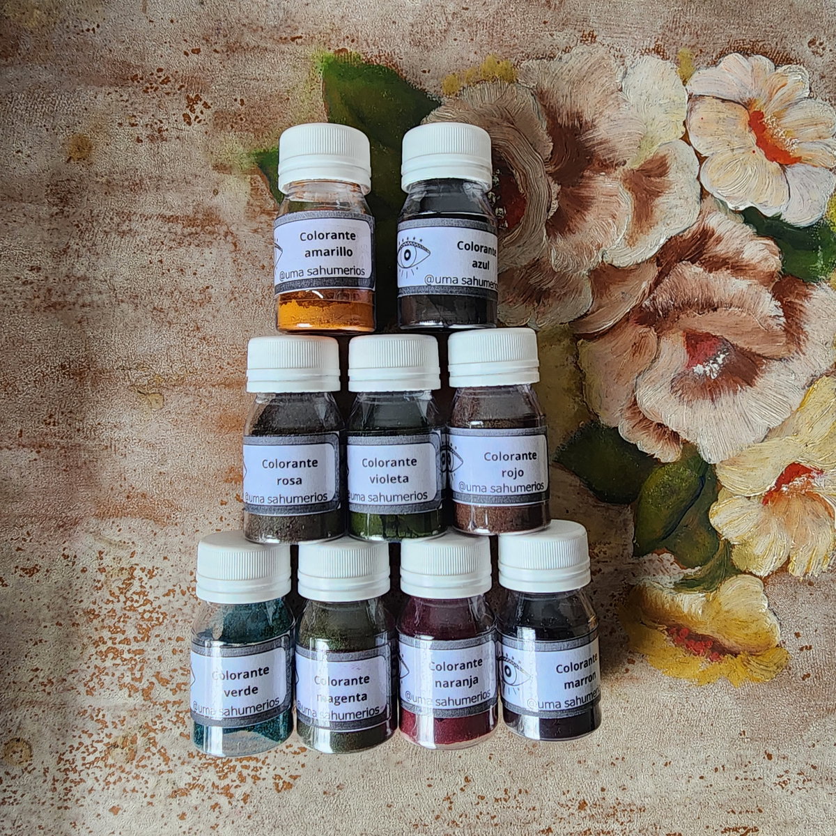Con el colorante en polvo soluble al alcohol podes obtener 1lt de colorantes para tus sahumerios, podes diluirlo en menos alcohol y asi poder generar luego distintas tonalidades de un mismo color